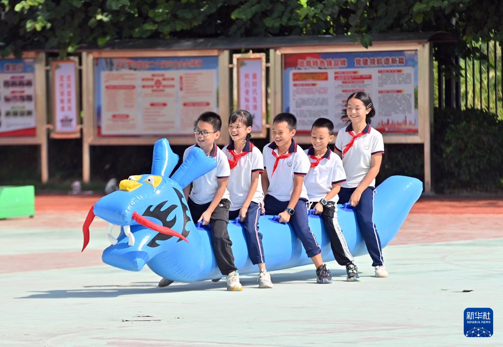 在梧州市长洲区龙平小学,学生们在体育大课间练习“旱地龙舟”(9月19日摄)。