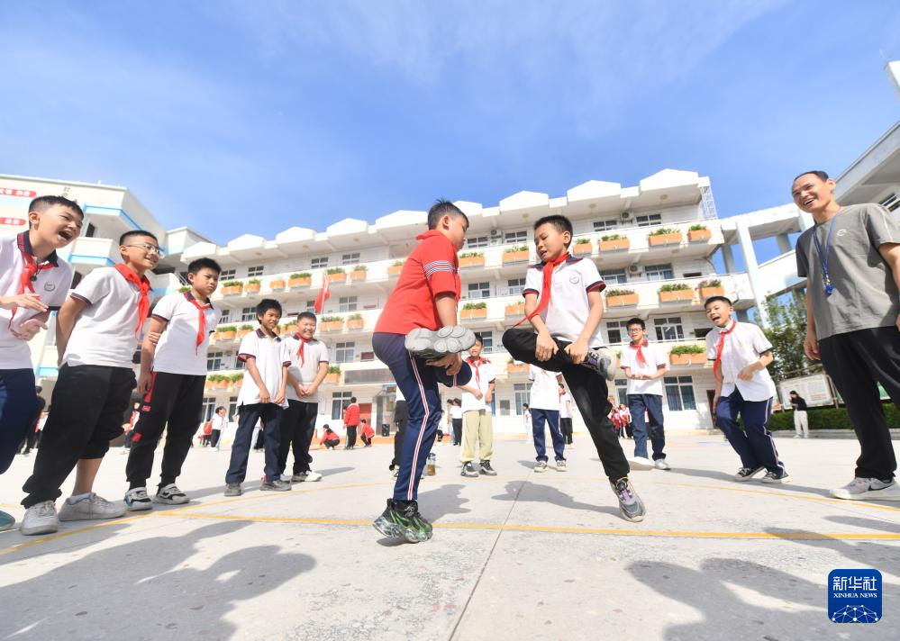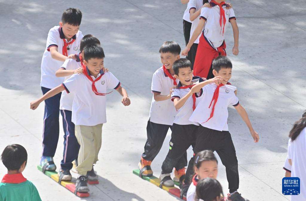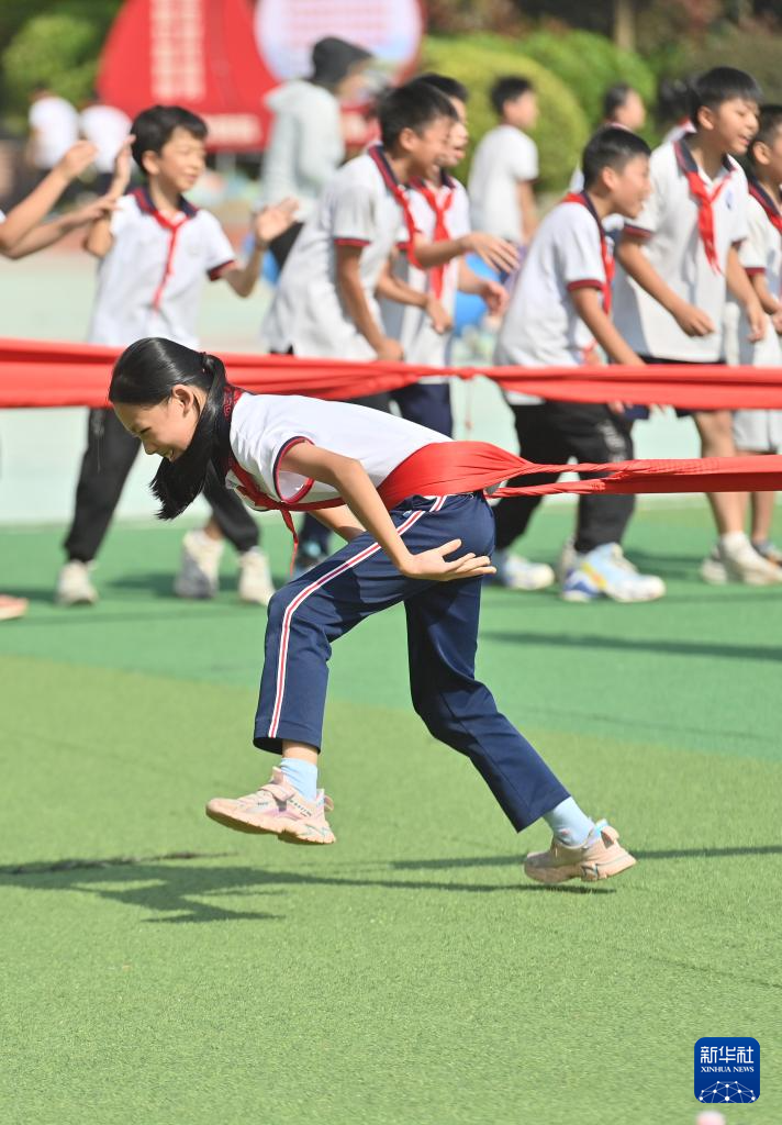 在梧州市龙平小学,学生们在体育大课间练习“大象拔河”(9月19日摄)。