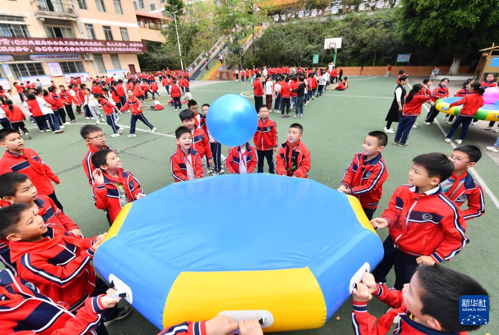 在梧州市平浪希望小学,学生们在体育大课间进行体育运动(10月25日摄)。