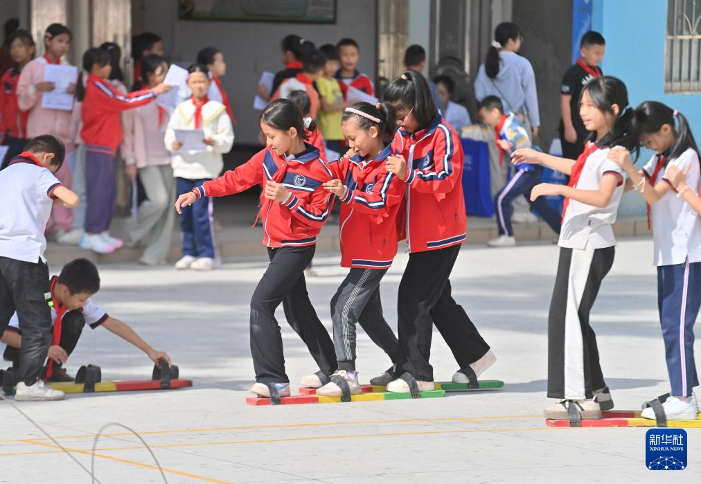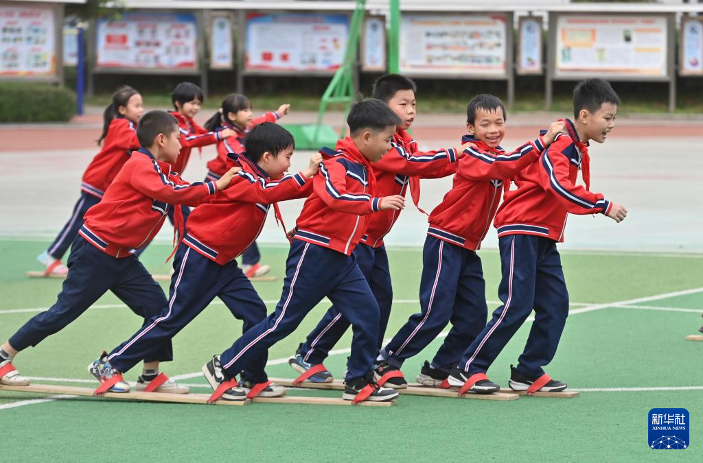 在梧州市平浪希望小学,学生们在体育大课间进行板鞋竞速练习(10月25日摄)。