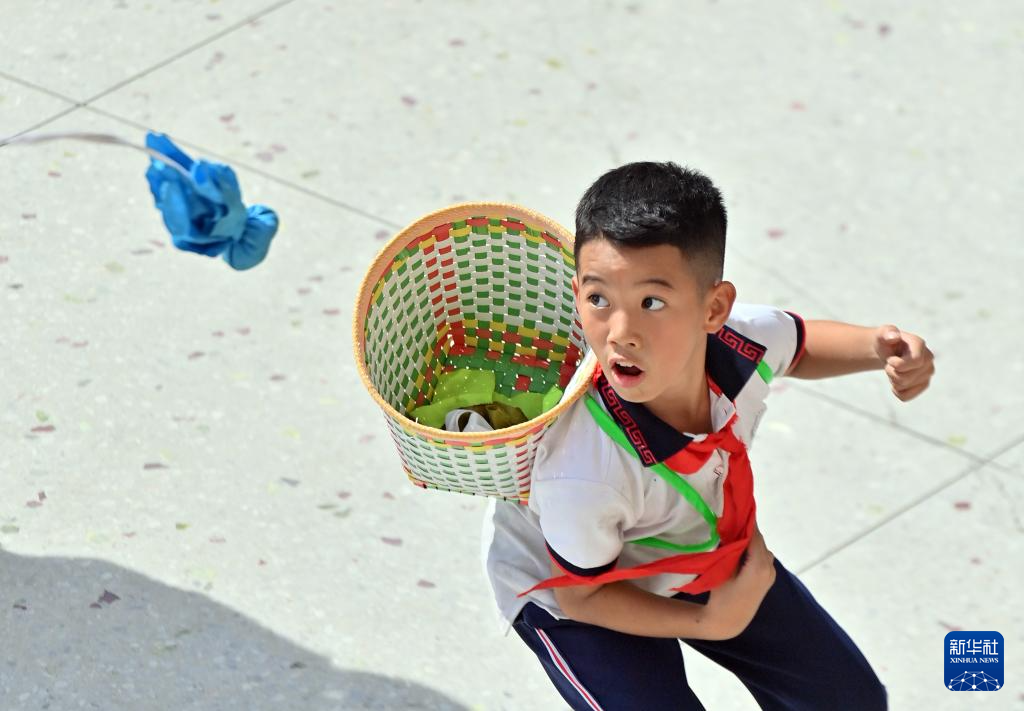 在梧州市平浪希望小学体育大课间,五年级学生董钰轩在抛绣球比赛中(10月25日摄)。