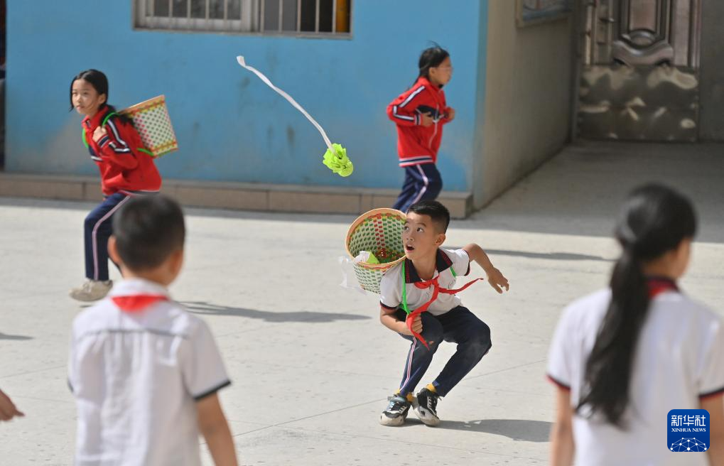 在梧州市平浪希望小学,五年级学生董钰轩(中)在体育大课间抛绣球比赛中(10月25日摄)。