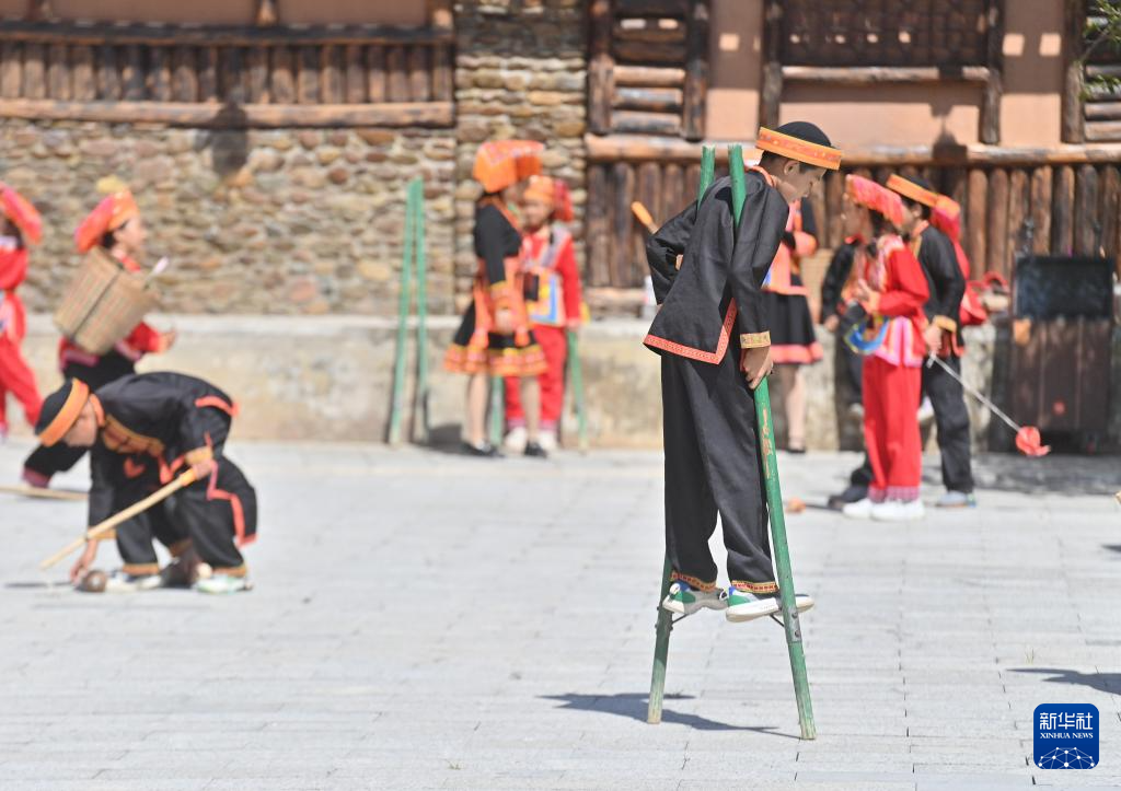 在梧州市蒙山县长坪瑶族乡图腾广场,民族学校的学生在练习踩高跷(10月23日摄)。