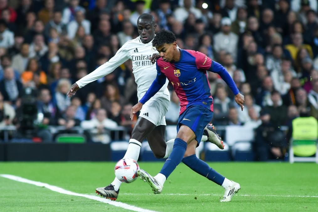 10月26日,皇家马德里队球员门迪(左)与巴塞罗那队球员亚马尔在比赛中拼抢。新华社发(古斯塔沃·巴连特 摄)