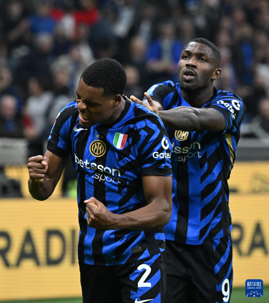 10月27日,国际米兰队球员邓弗里斯(左)与队友图拉姆庆祝进球。