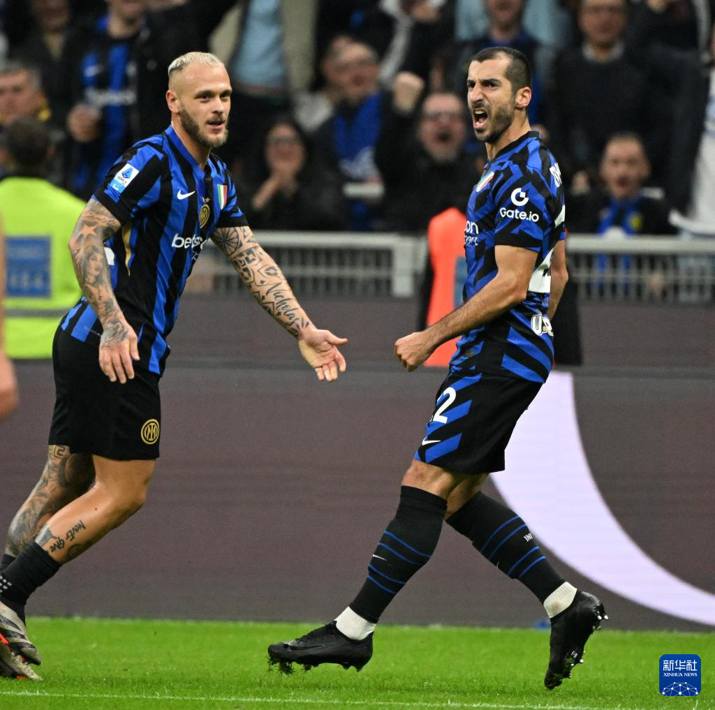 10月27日,国际米兰队球员姆希塔良(右)与队友迪马尔科庆祝进球。
