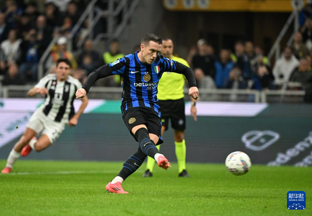 10月27日,国际米兰队球员泽林斯基在比赛中主罚点球得分。