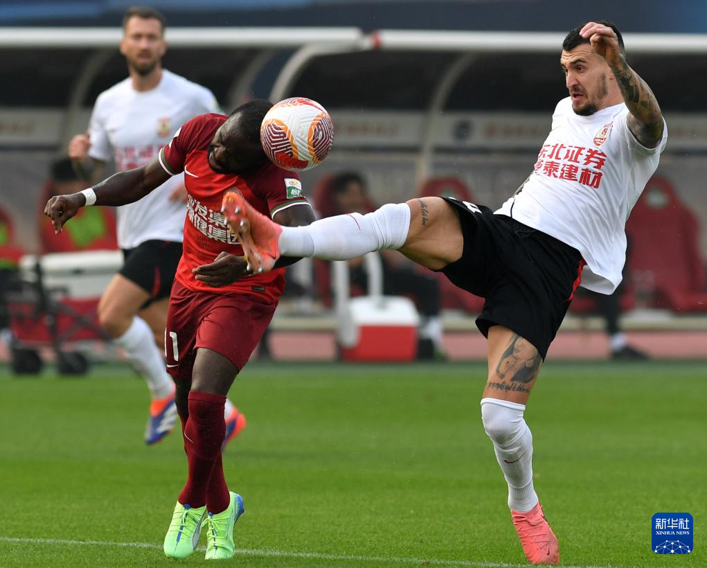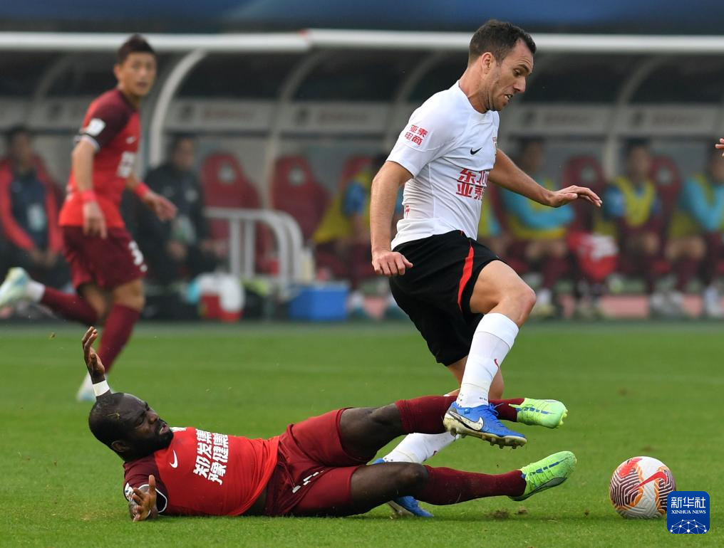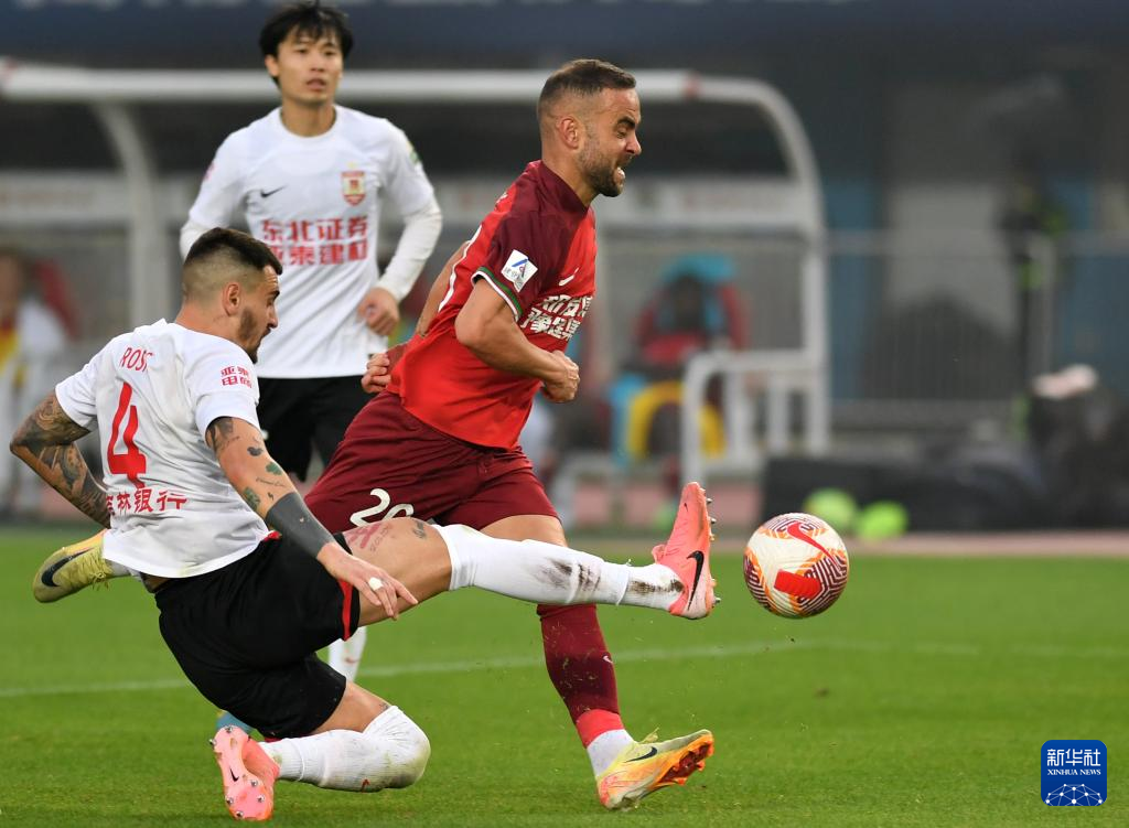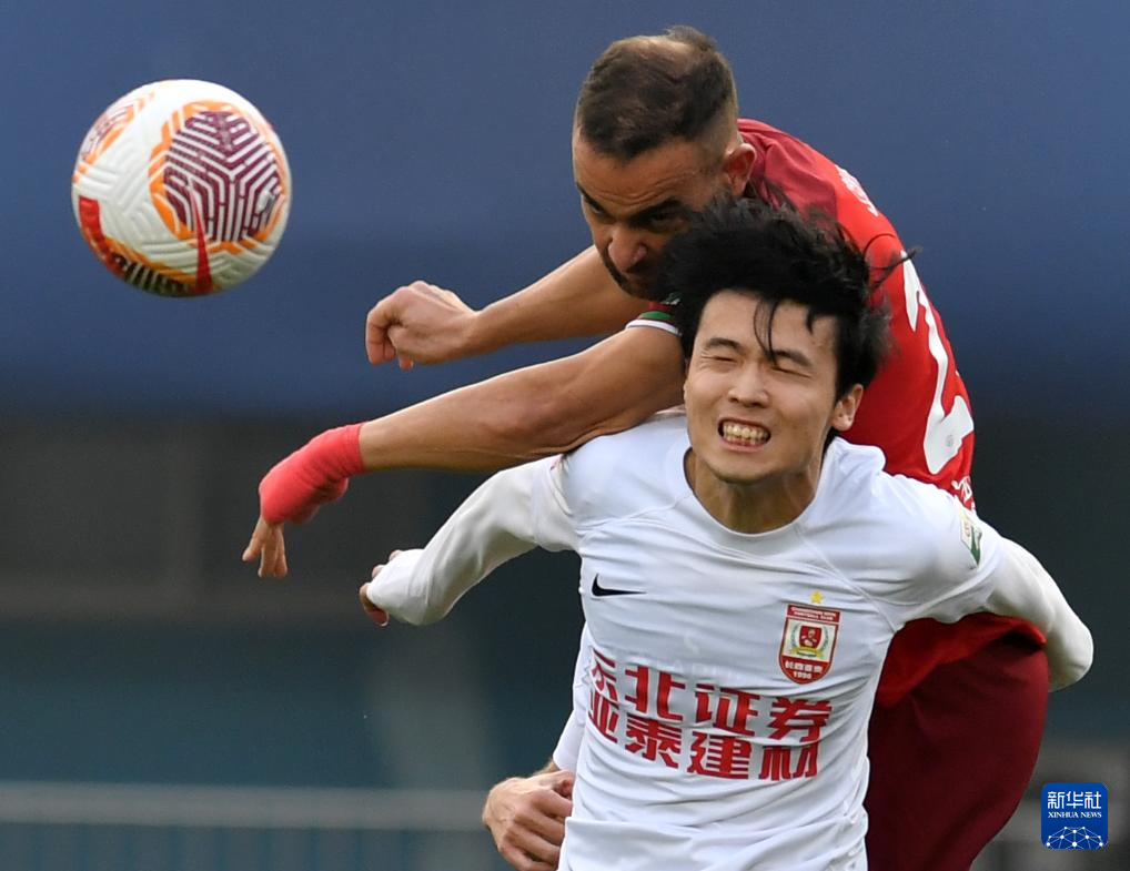 10月27日,河南俱乐部酒祖杜康队球员尼曼贾·科维奇(后)与长春亚泰队球员李申圆在比赛中争抢头球。