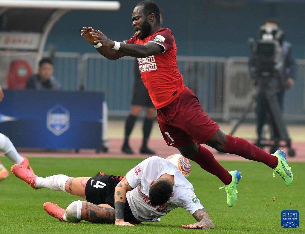 10月27日,河南俱乐部酒祖杜康队球员阿奇姆彭(下)与长春亚泰队球员塞尔吉尼奥(右)在比赛中拼抢。