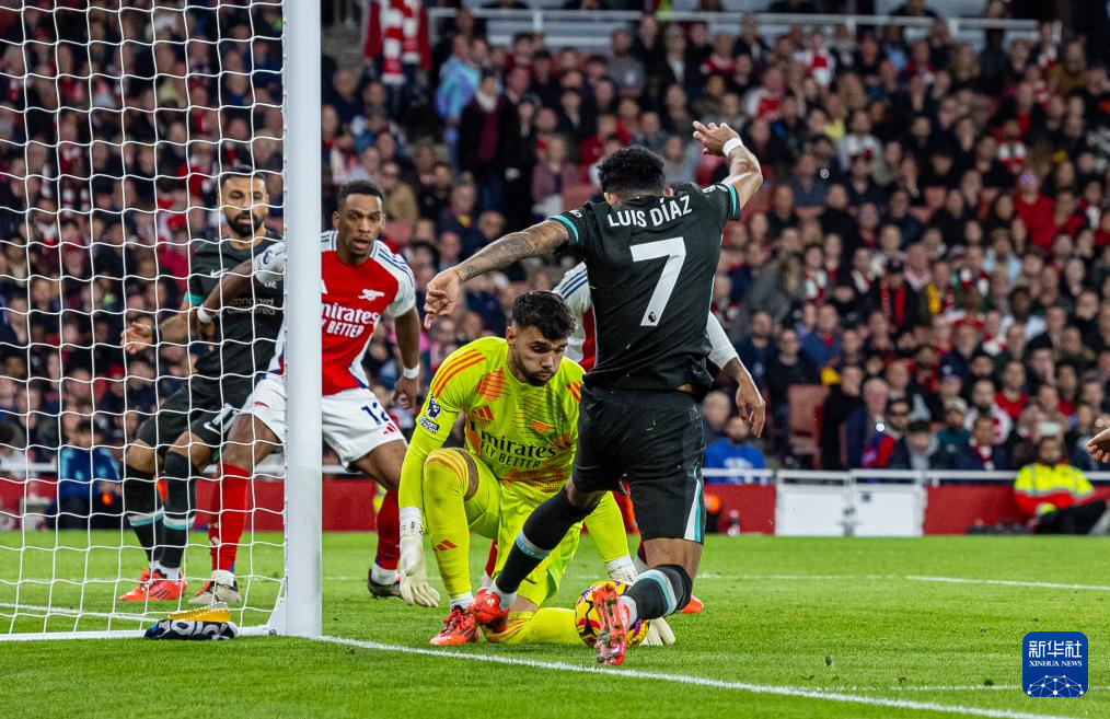10月27日,利物浦队球员路易斯·迪亚斯(前)的射门被阿森纳队门将拉亚(右二)拦截。