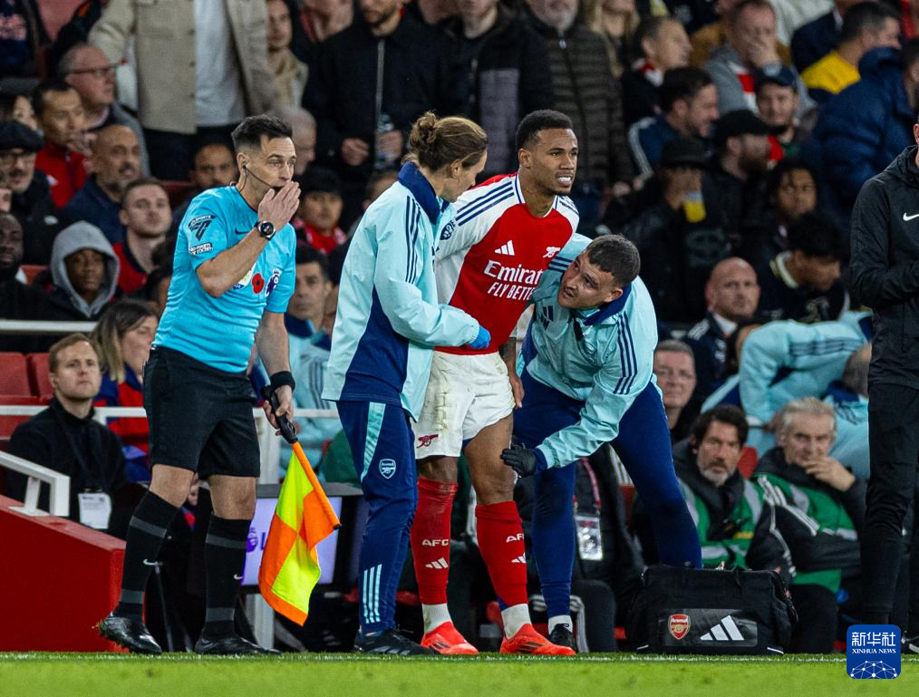 10月27日,阿森纳队球员加布里埃尔(前右二)因伤下场。
