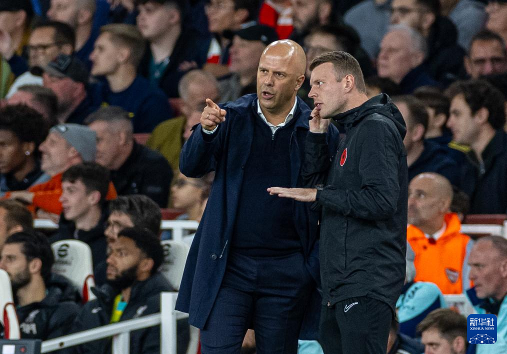 10月27日,利物浦队主教练斯洛特(左)在场边观战。