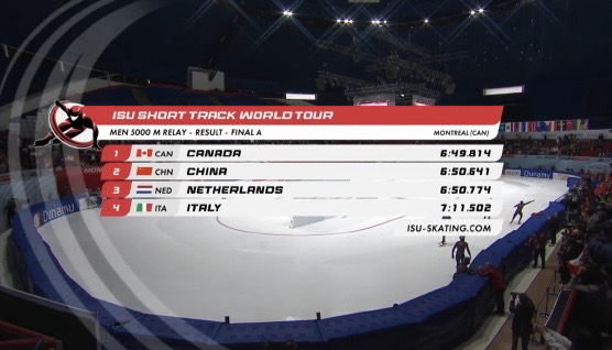 在男子5000米接力A组决赛中,今年世锦赛冠军中国队与加拿大、意大利和荷兰队同场竞技。加拿大队全程领滑并逐渐拉开距离。中国队由林孝埈、刘少昂、刘少林和孙龙组成,虽然在比赛中他们狂追到第二位,但始终无法靠近加拿大队。欧洲强队荷兰一度试图近身反超中国队,但被中国队果断封堵路线。最终,加拿大队以6分49秒814夺金,中国队的成绩是6分50秒641,荷兰队收获铜牌。