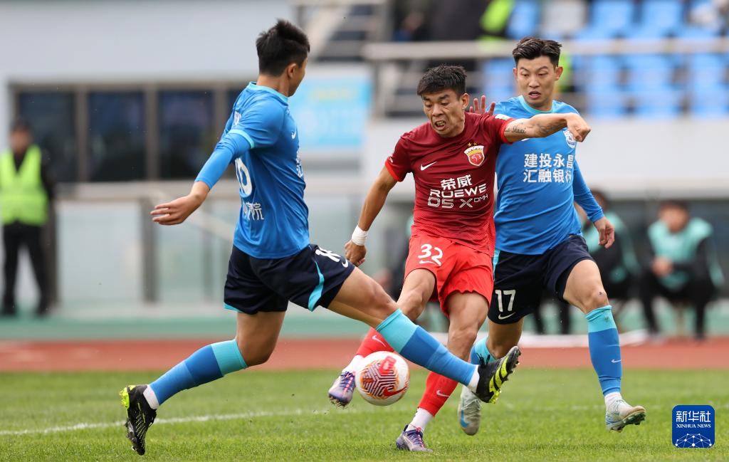 10月27日,上海海港队球员李帅(中)在比赛中射门。