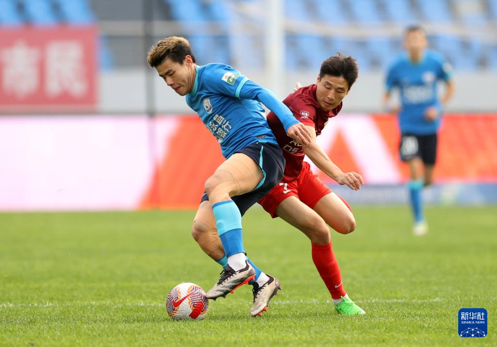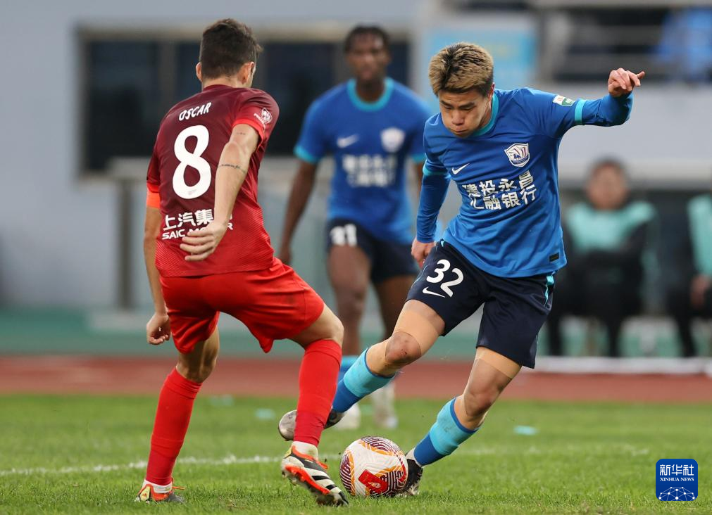 10月27日,沧州雄狮队球员孙铭谦(前右)和上海海港队球员奥斯卡在比赛中拼抢。