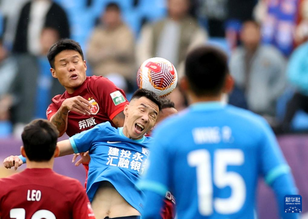 10月27日,上海海港队球员李昂(左上)在比赛中和沧州雄狮队球员刘鑫瑜(右二)争顶。