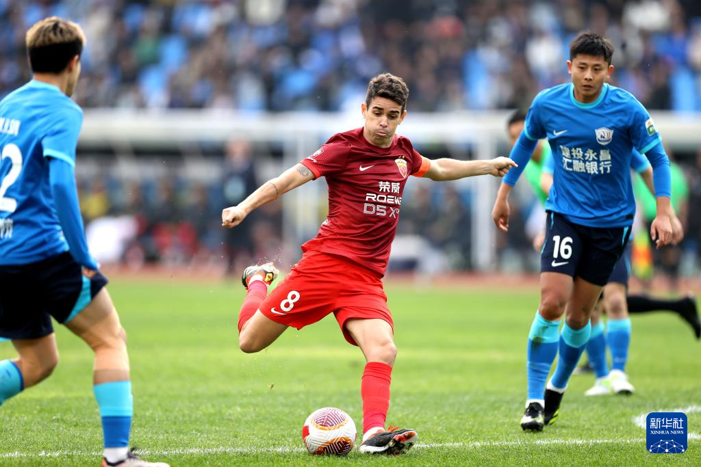 10月27日,上海海港队球员奥斯卡(中)在比赛中射门。