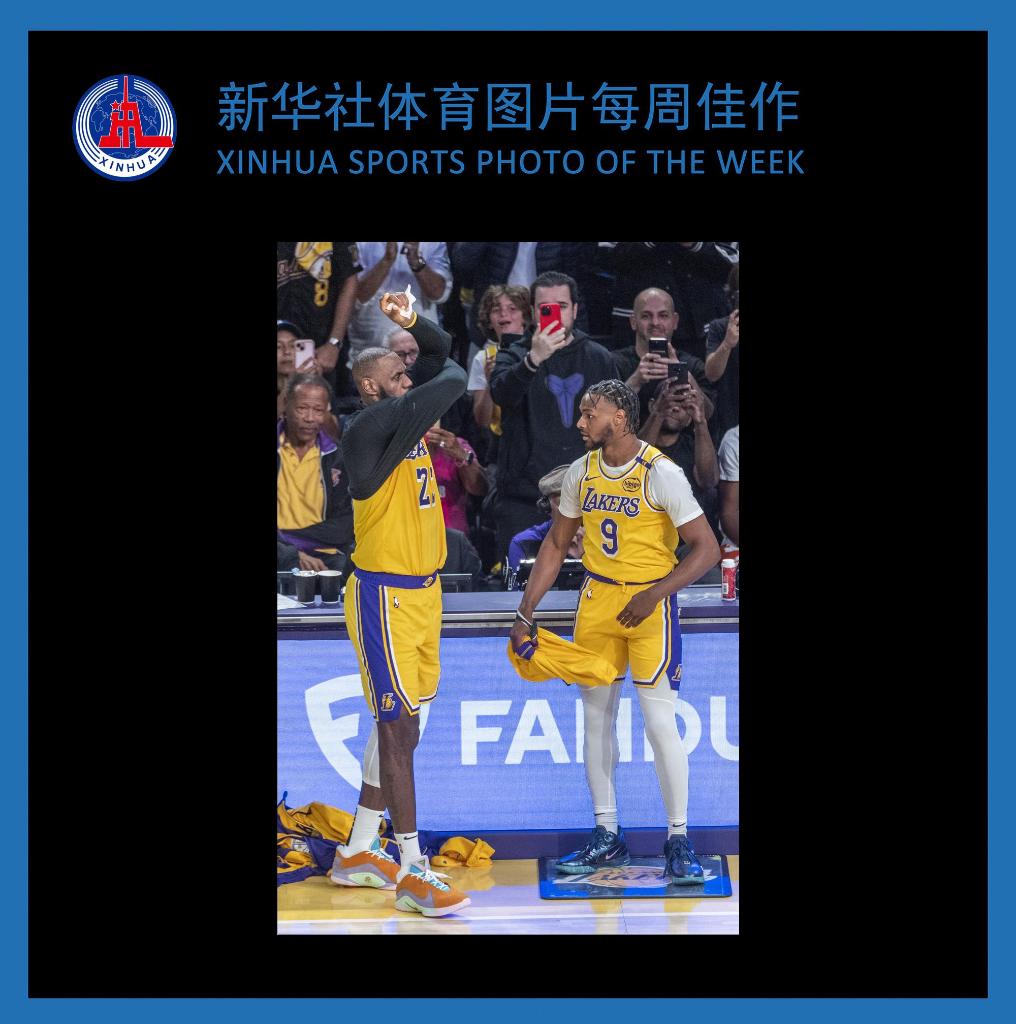 10月22日,湖人队球员勒布朗·詹姆斯(左)与儿子布朗尼·詹姆斯准备上场比赛。