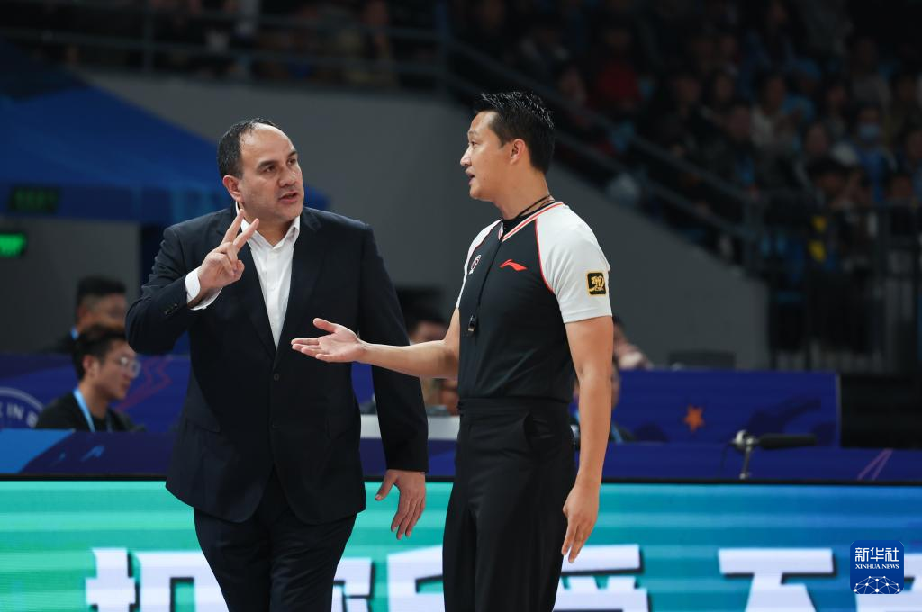10月29日,宁波町渥队主教练卡梅隆(左)在比赛中与裁判交流。