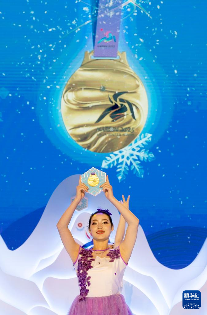 10月30日,演员在活动现场展示亚冬会奖牌“竞速精神”的背面。