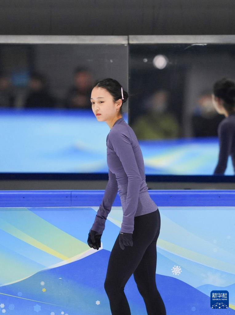 11月1日,女子单人滑运动员陈虹伊在训练前拉伸。