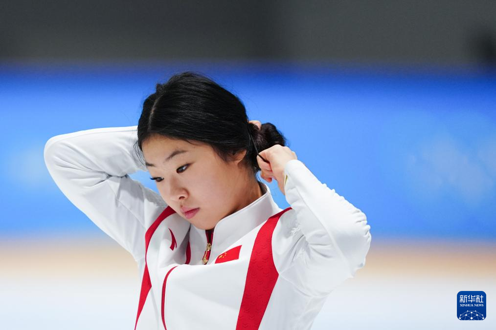 11月1日,女子单人滑运动员安香怡在训练前扎头发。