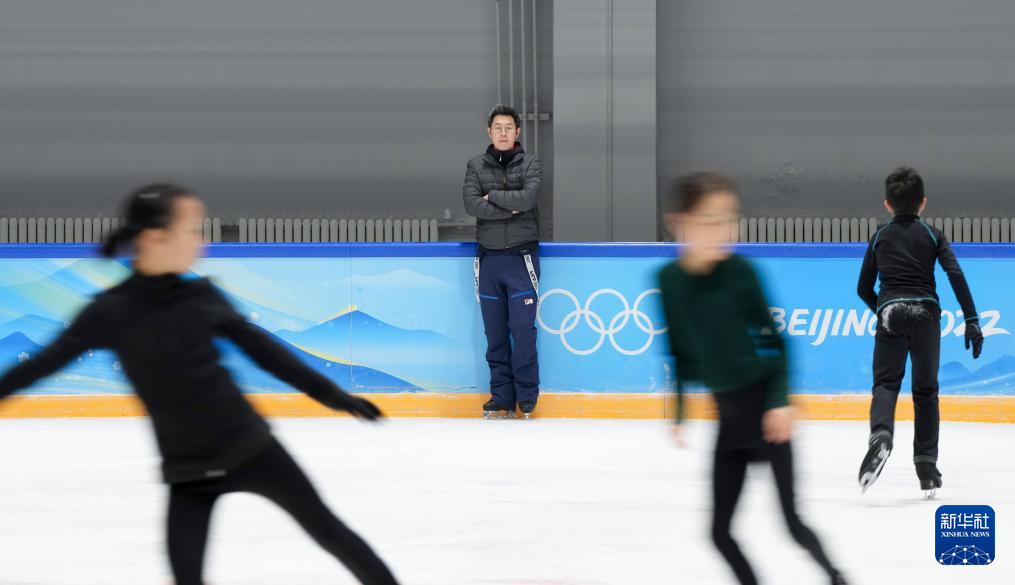 11月1日,双人滑教练员关金林(左二)观看运动员训练。