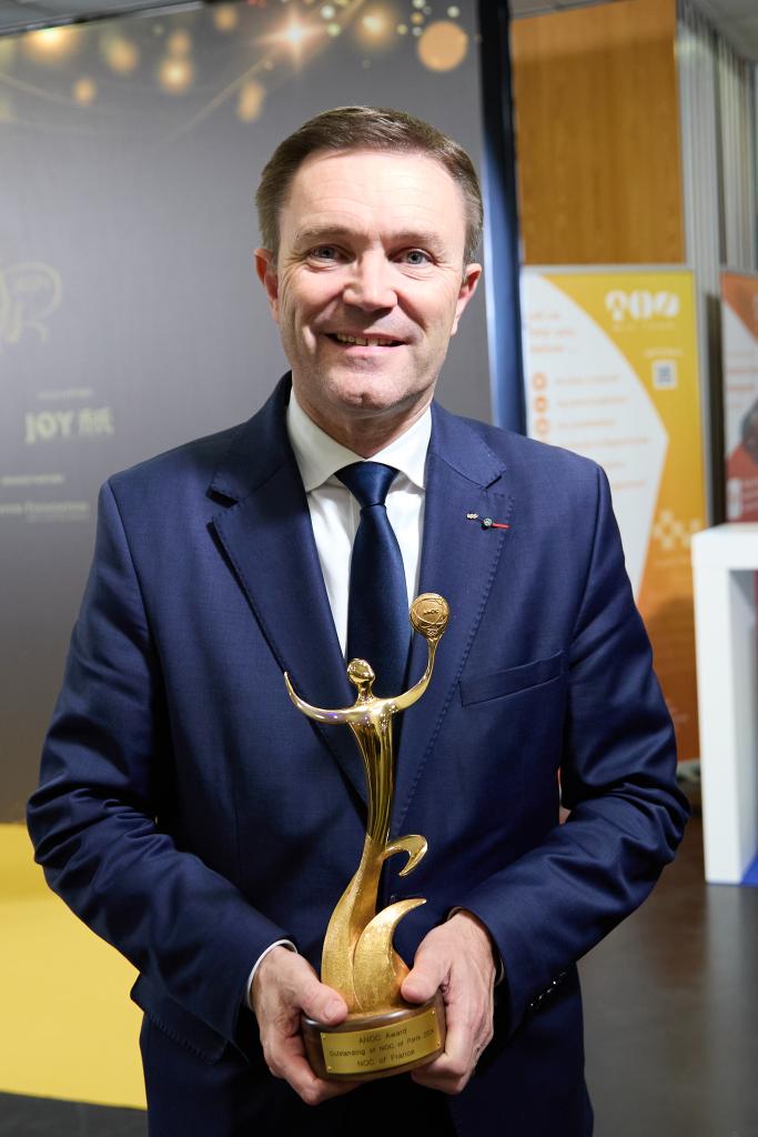 10月30日,法国奥委会主席拉帕尔蒂安在国际奥协全体大会颁奖典礼后展示“最佳国家或地区奥委会”奖杯。新华社记者 孟鼎博 摄