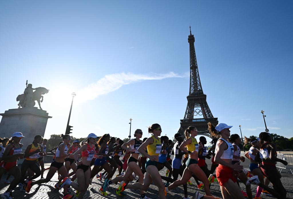 8月11日,在巴黎奥运会女子马拉松比赛中,选手途经埃菲尔铁塔。新华社记者 宋彦桦 摄