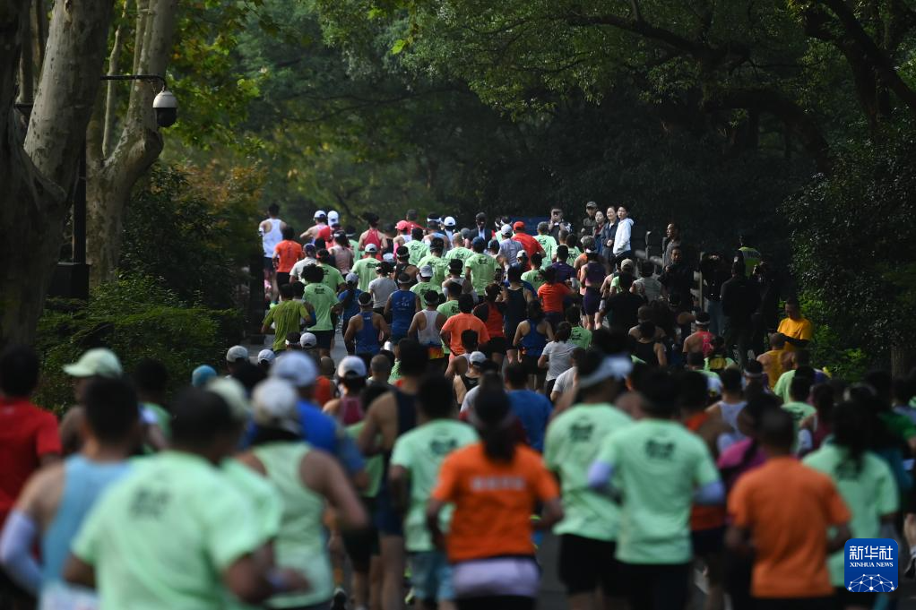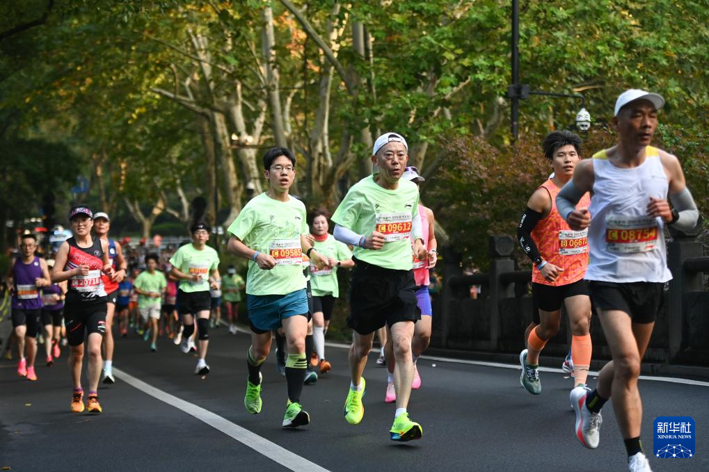 11月3日,参赛选手在西湖景区杨公堤上奔跑。