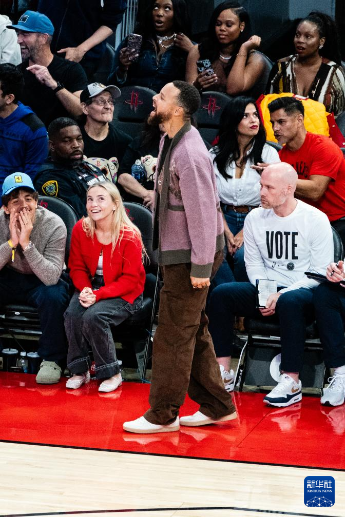 11月2日,勇士队球员斯蒂芬·库里在场边为队友加油。