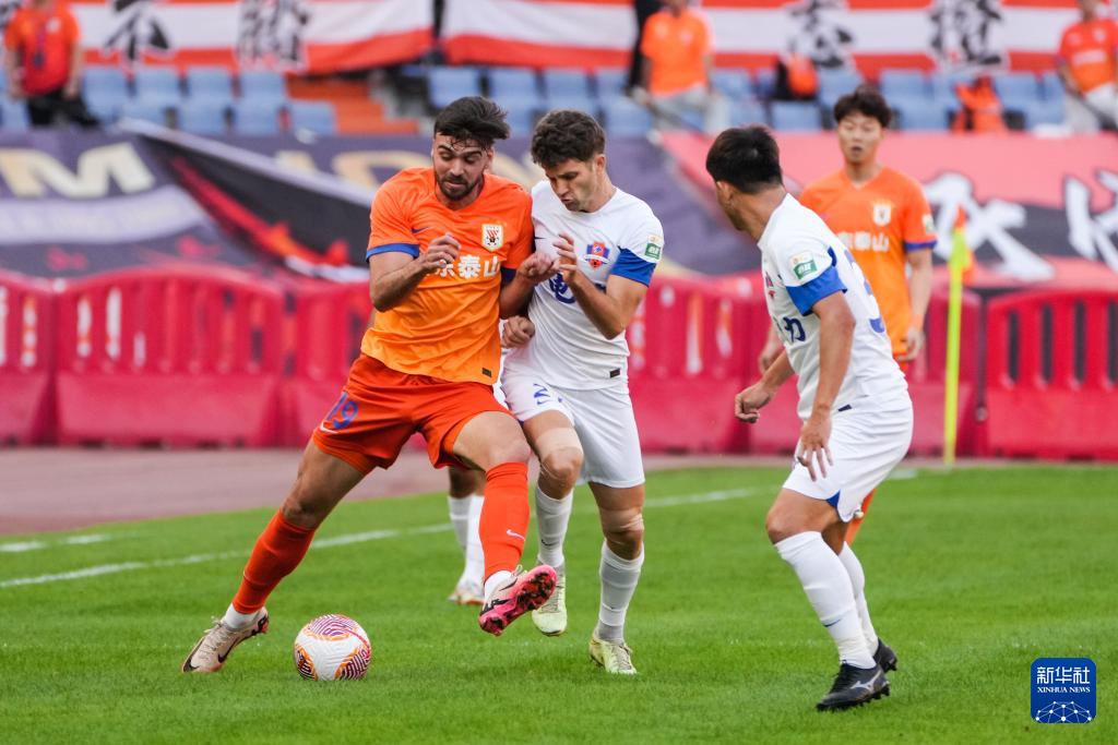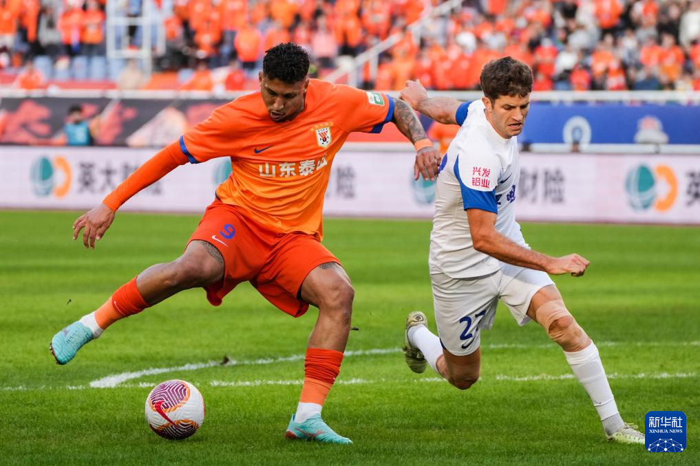 11月2日,山东泰山队球员泽卡(上)在比赛中突破受阻。