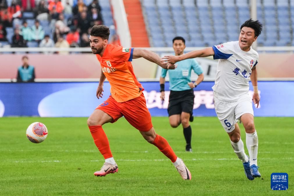 11月2日,山东泰山队球员谢文能(上)在比赛中突破遭到对方球员铲断。