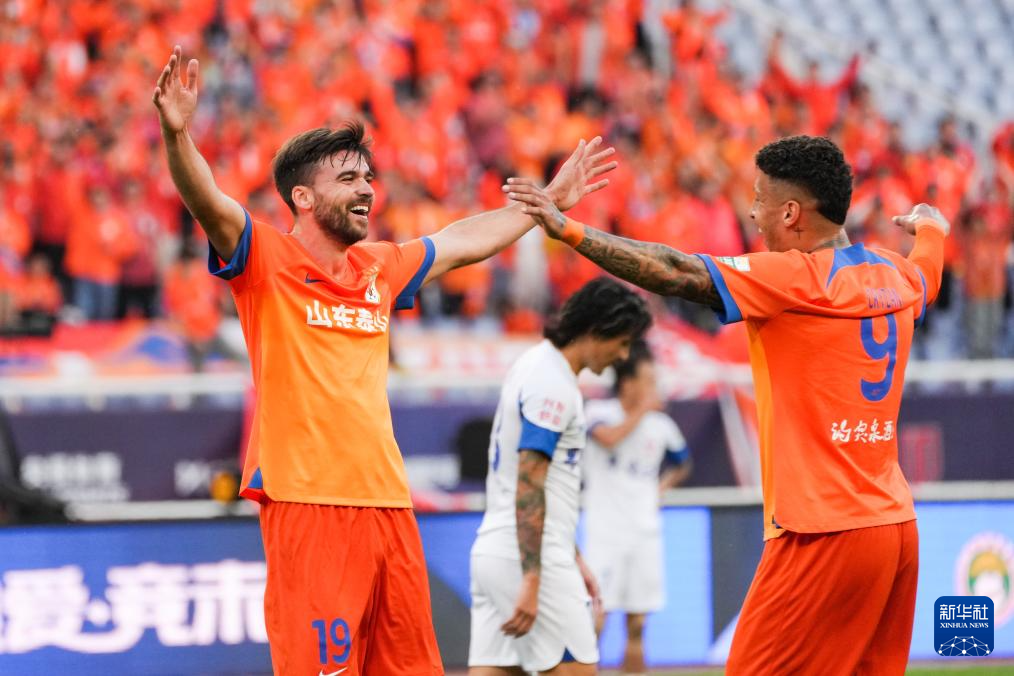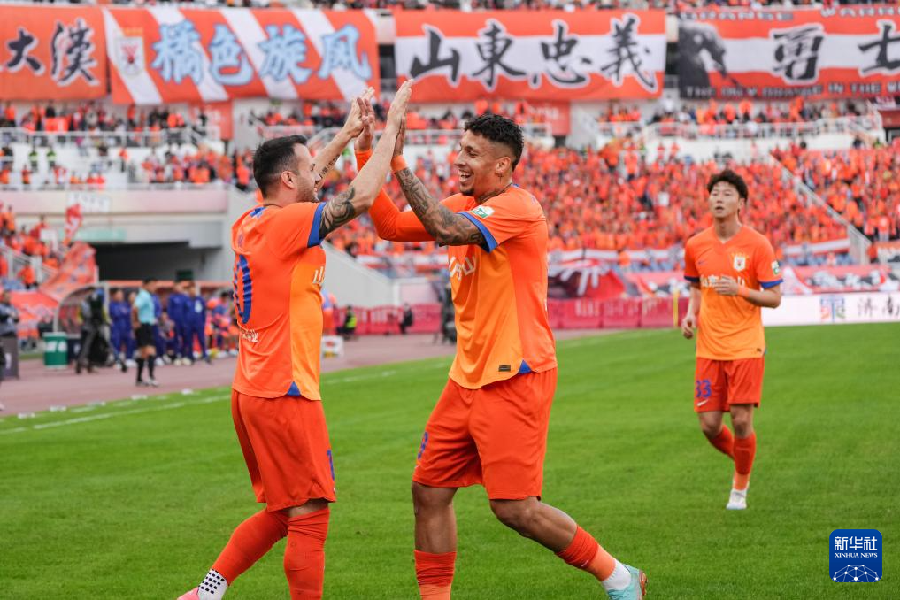 11月2日,山东泰山队球员泽卡(左)进球后与队友庆祝。