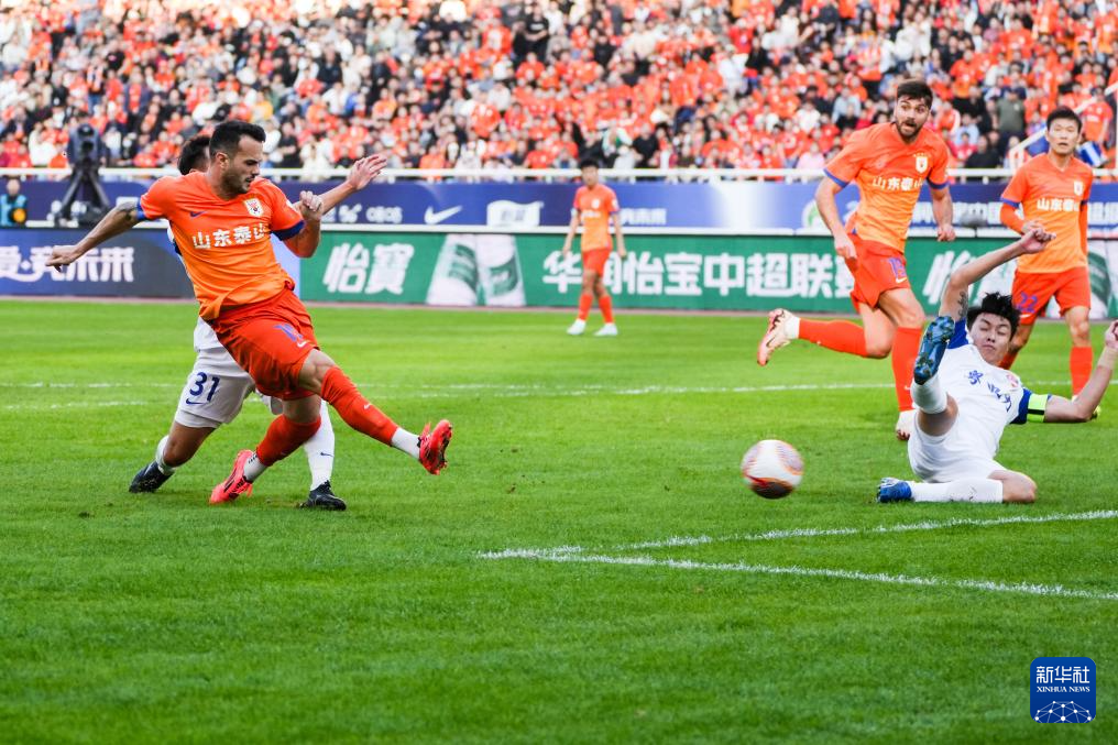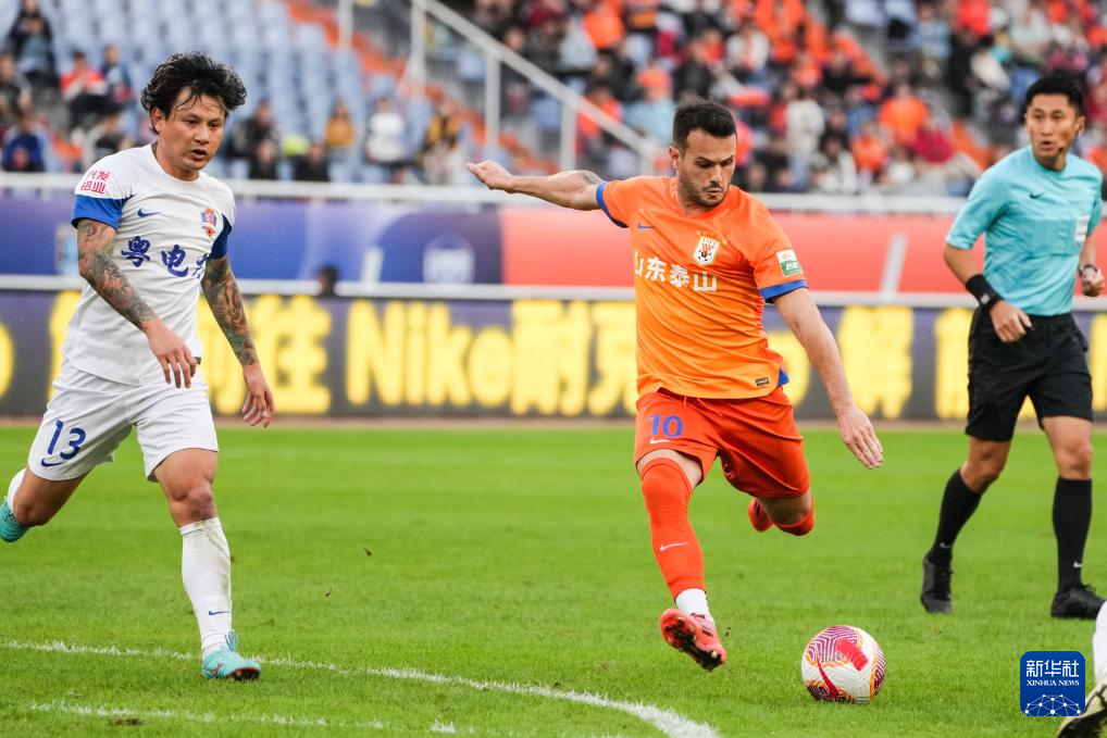 11月2日,山东泰山队球员卡扎伊什维利(左)在比赛中射门。
