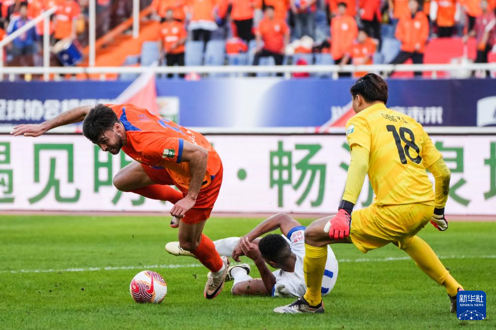 11月2日,山东泰山队球员卡扎伊什维利(右)在比赛中射门。