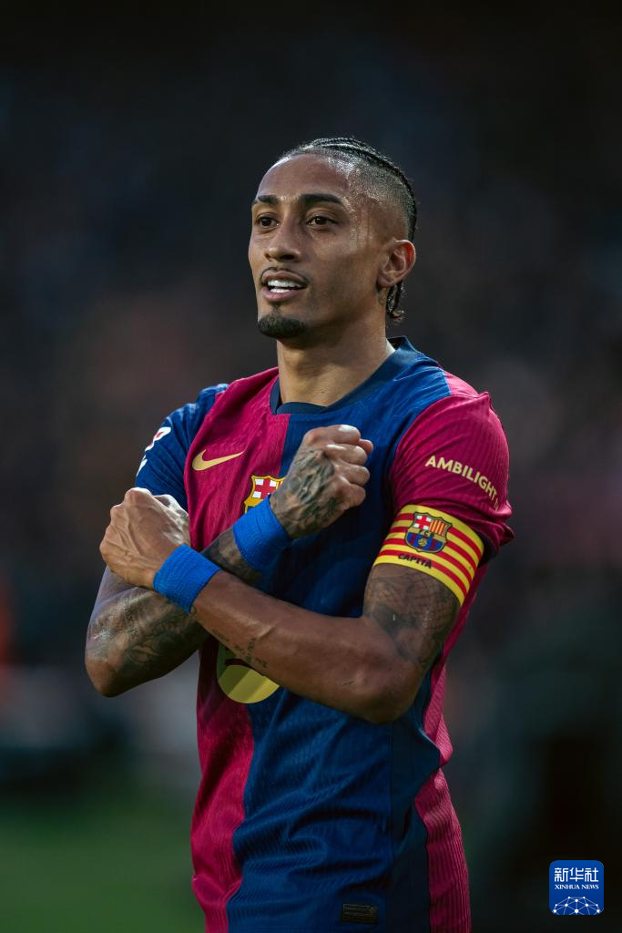11月3日,巴塞罗那队球员拉菲尼亚庆祝进球。