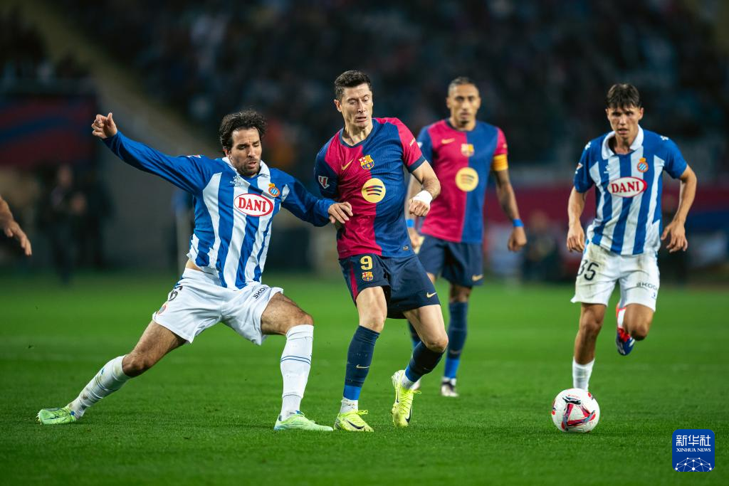 11月3日,巴塞罗那队球员莱万多夫斯基(左二)与西班牙人队球员卡布雷拉在比赛中拼抢。