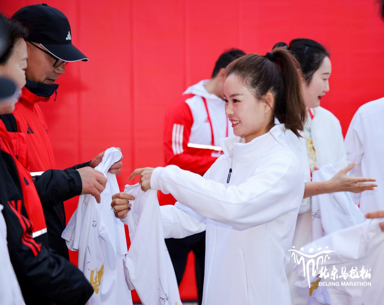 中国田径运动员杨家玉为北马裁判赠予签名T恤。组委会供图