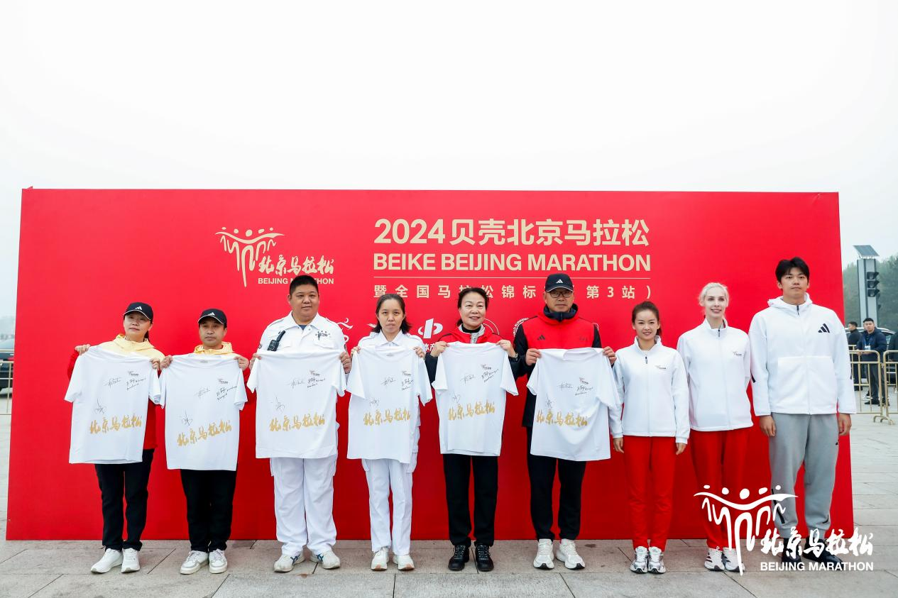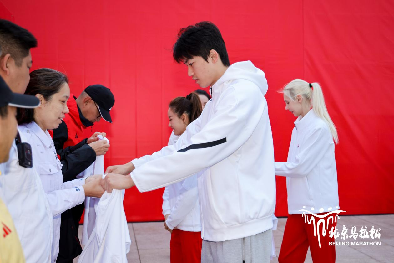 清晨的微光中,三位奥运健儿来到起点位置,为多年奉献于北马的裁判、医师及志愿者代表,赠予亲笔签名T恤,以此感谢他们对北马多年来所做的贡献。同时,奥运健儿还鼓励参赛跑者汲取奥运精神的力量,挑战自我,勇往直前。