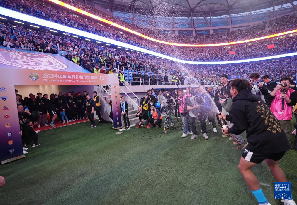 11月3日,大连英博队成员赛后庆祝冲超成功。