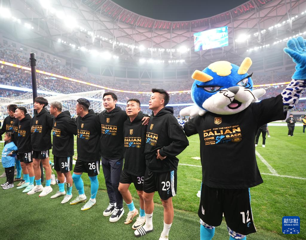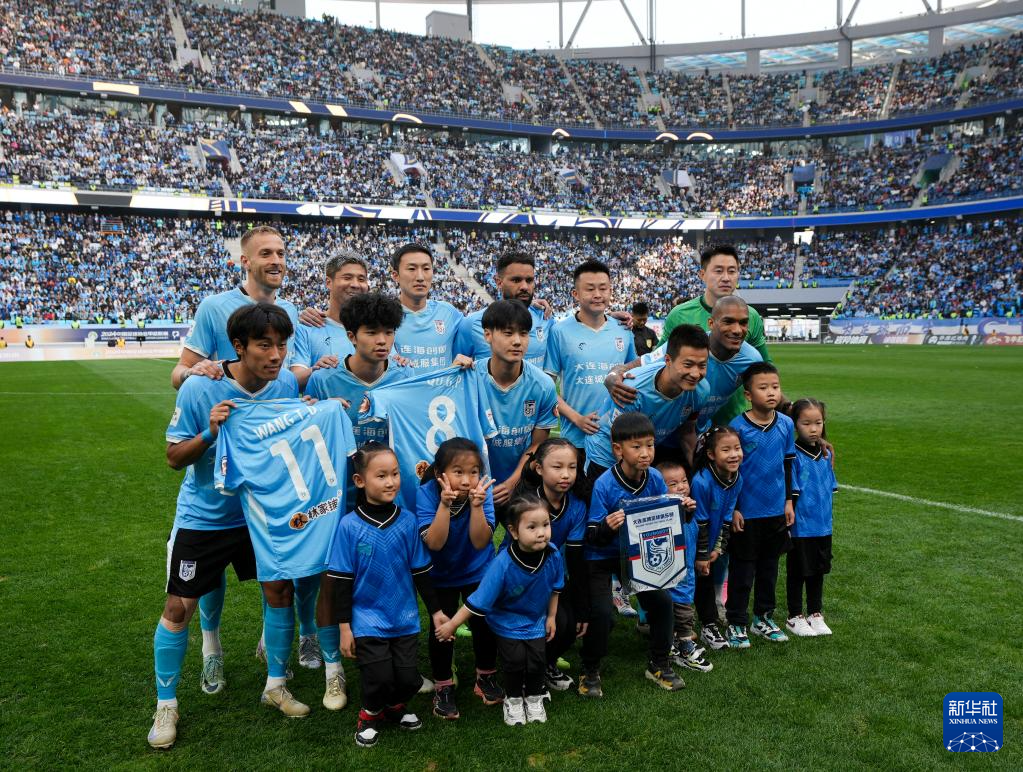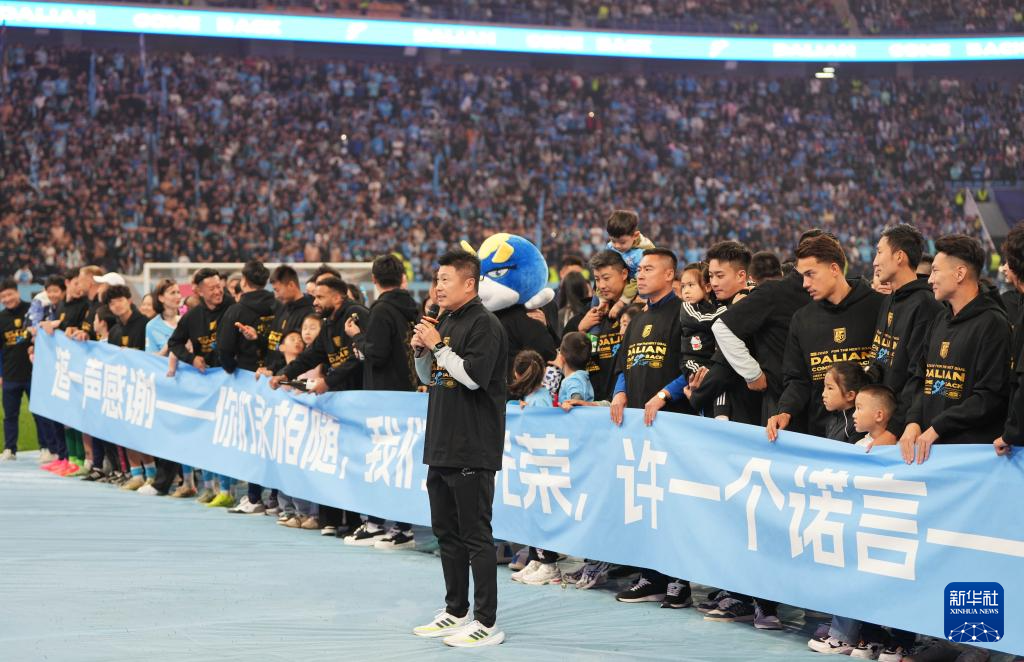 11月3日,大连英博队球员和吉祥物在赛后与球迷互动。