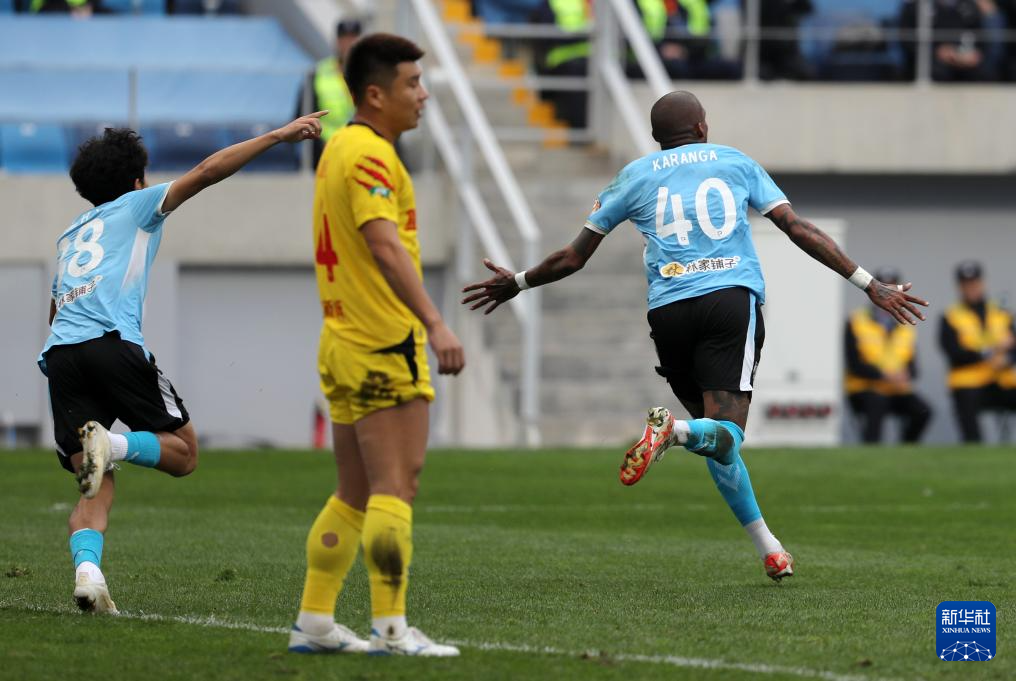 11月3日,大连英博队球员卡兰加(右)庆祝进球。