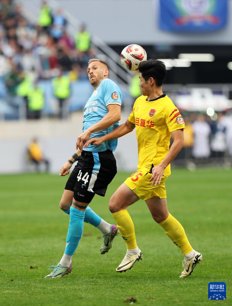 11月3日,上海嘉定汇龙队球员杨贵炎(右)与大连英博队球员科特尼克拼抢。