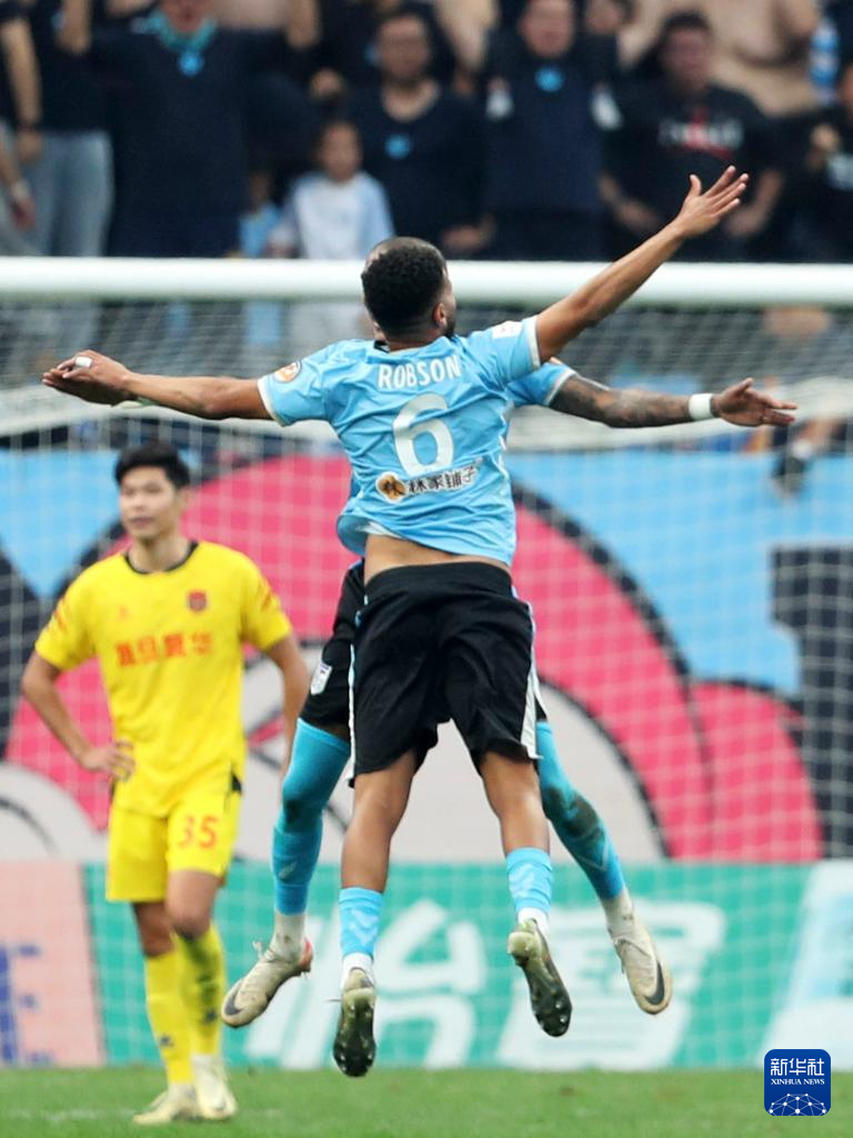 11月3日,大连英博队球员罗伯森(前)赛后和队友庆祝。