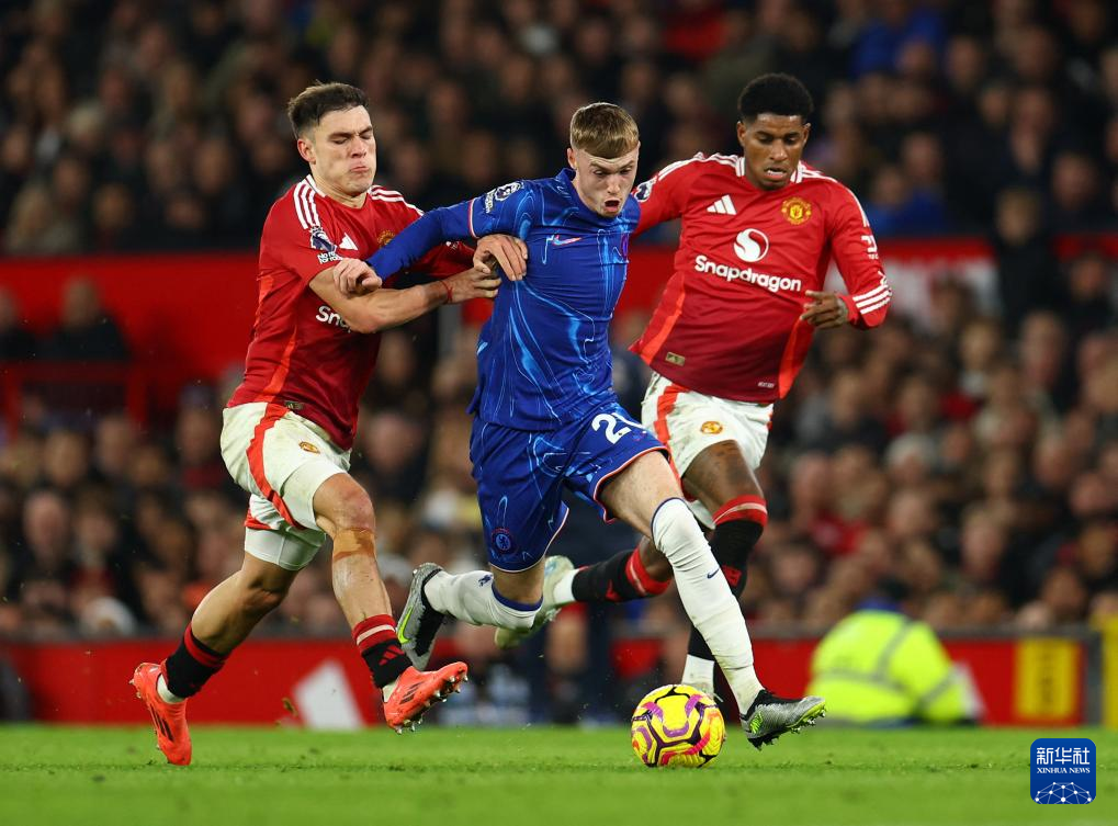 11月3日,切尔西队球员帕尔默(中)在比赛中突破曼联队球员乌加特(左)、拉什福德防守。