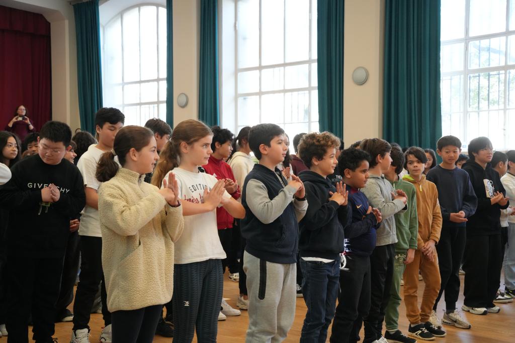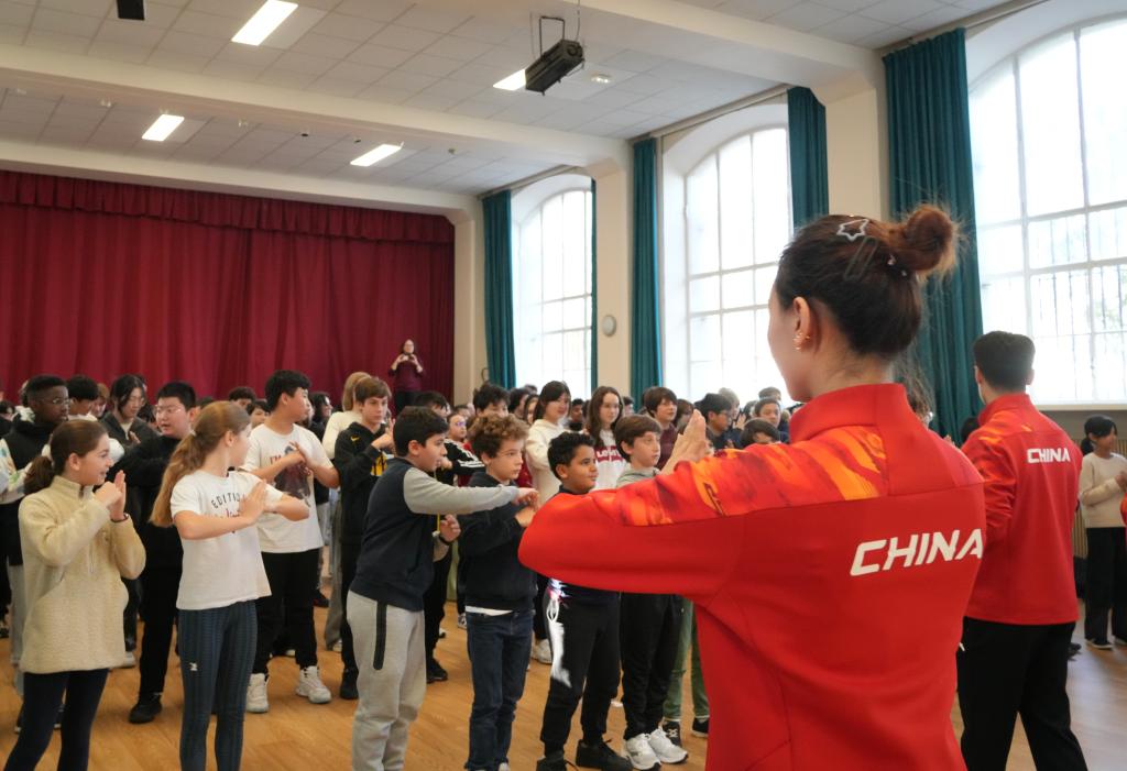 记者当天在现场注意到,运动员们的表演让学生们大呼过瘾,随后的武术动作教学环节更是让学生们兴奋不已。11岁的阿伦此前在英国读书,4年前随父母搬到巴黎居住,从那时起开始接触武术。当台上的世界冠军们教授中国武术传统的抱拳礼时,他以“资深武者”的姿态向同学们介绍起抱拳礼的含义。