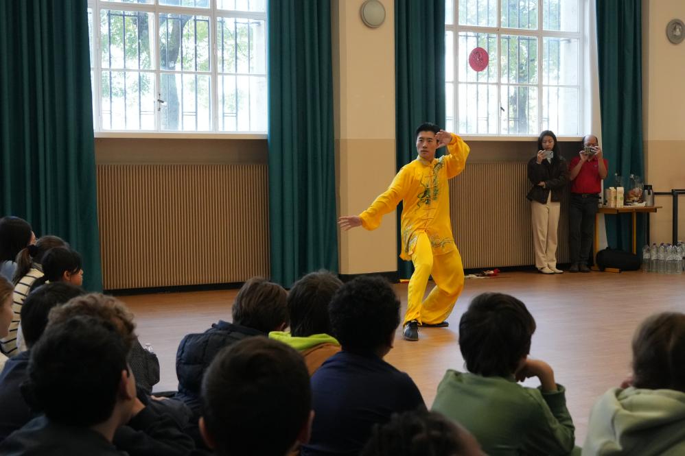 据张玉萍介绍,除了当天走进法国校园的活动,这支队伍前几日还在巴黎与法国国家武术队合作举办了一场武术表演,并在巴黎中国文化中心进行了一场关于武术文化的讲座,还在埃菲尔铁塔下带来了一场武术“快闪”活动。