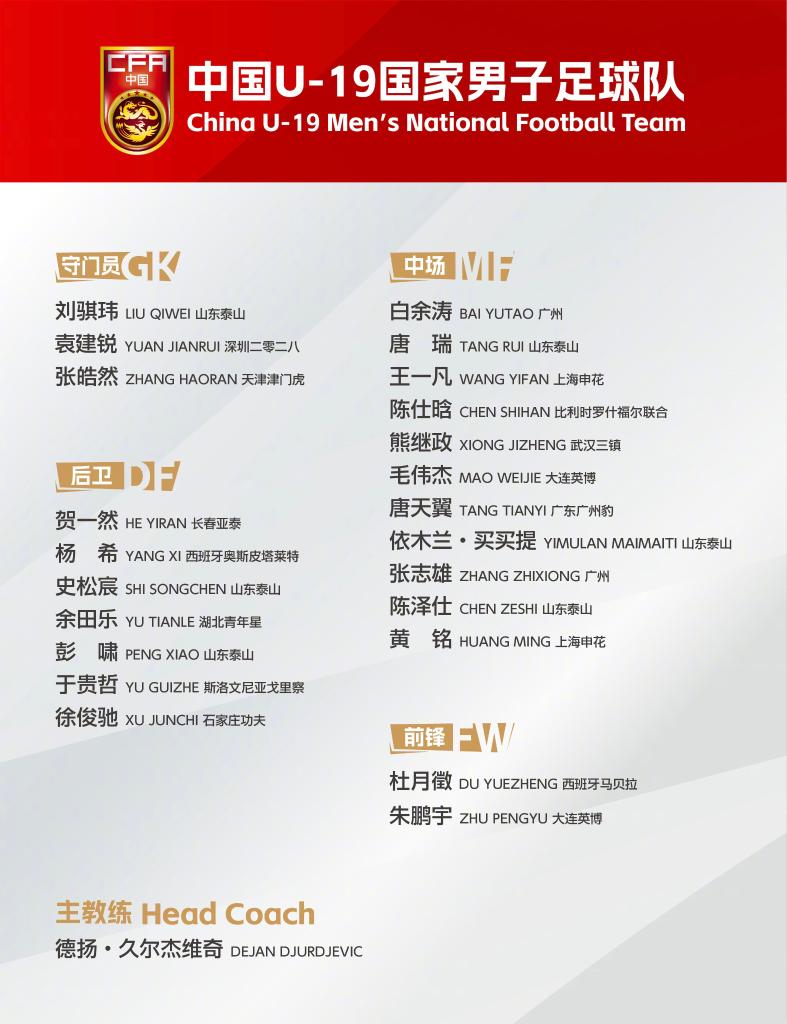 中国U19男足主教练是久尔杰维奇,共有23名球员参加此次集训,其中来自山东泰山俱乐部的球员最多,有史松宸、彭啸、陈泽仕等6人。
