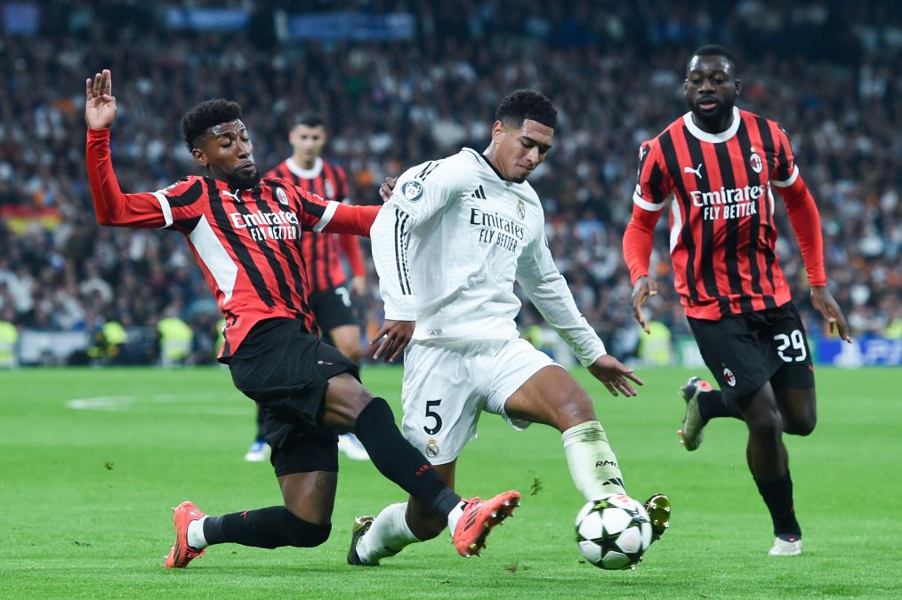 11月5日,皇家马德里队球员贝林厄姆(中)与AC米兰队球员埃默森在比赛中拼抢。新华社发(古斯塔沃·巴连特摄)